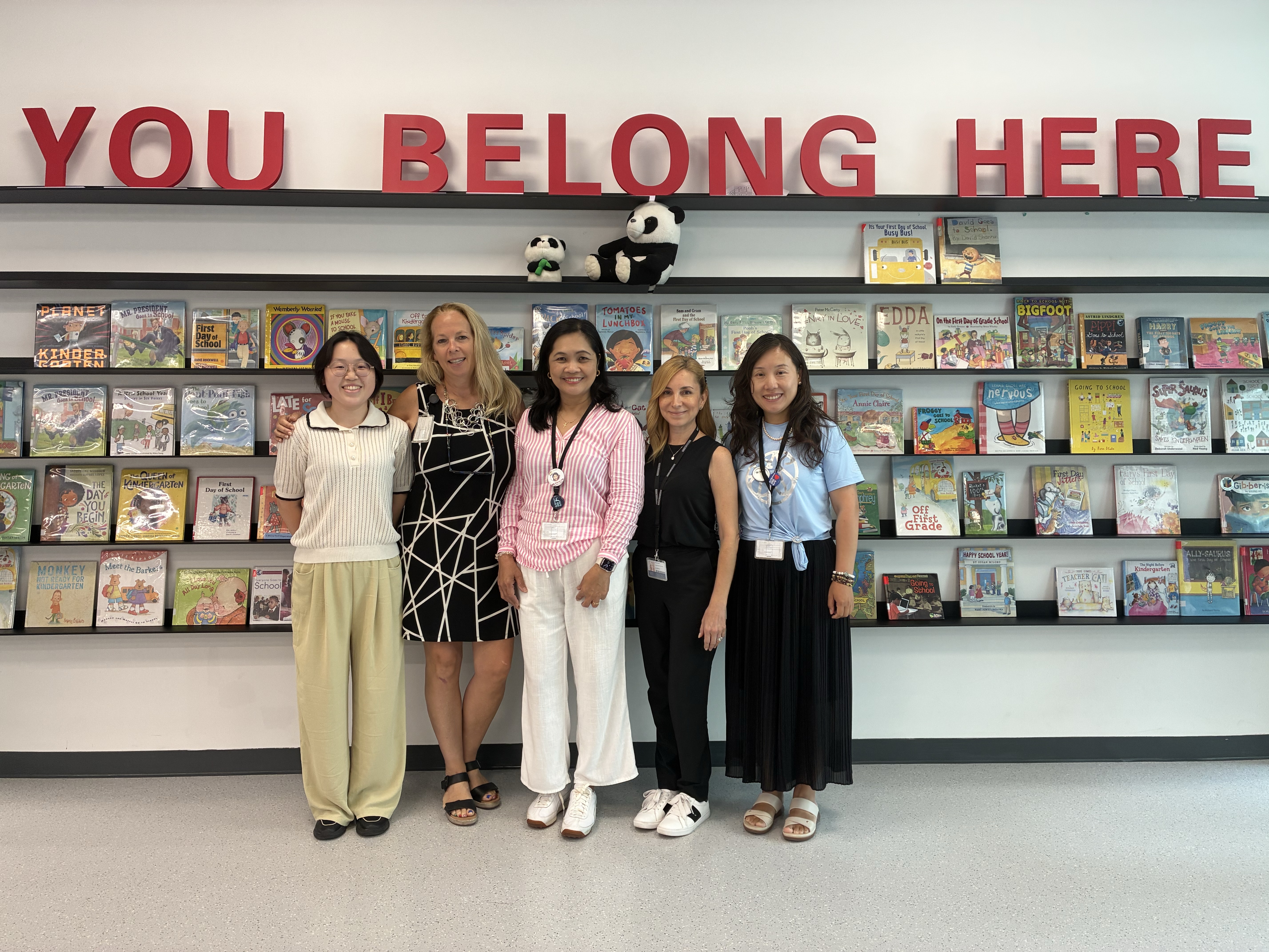 From left to right: , Ms. Jessy Liu (Library TA), Ms. Leslie Henry (Schoolwide Librarian), Ms. Marilyn Sicat (Library TA), Ms. Claudia Reyes (Librarian); and Ms. Joleen Jiang (Library TA).
